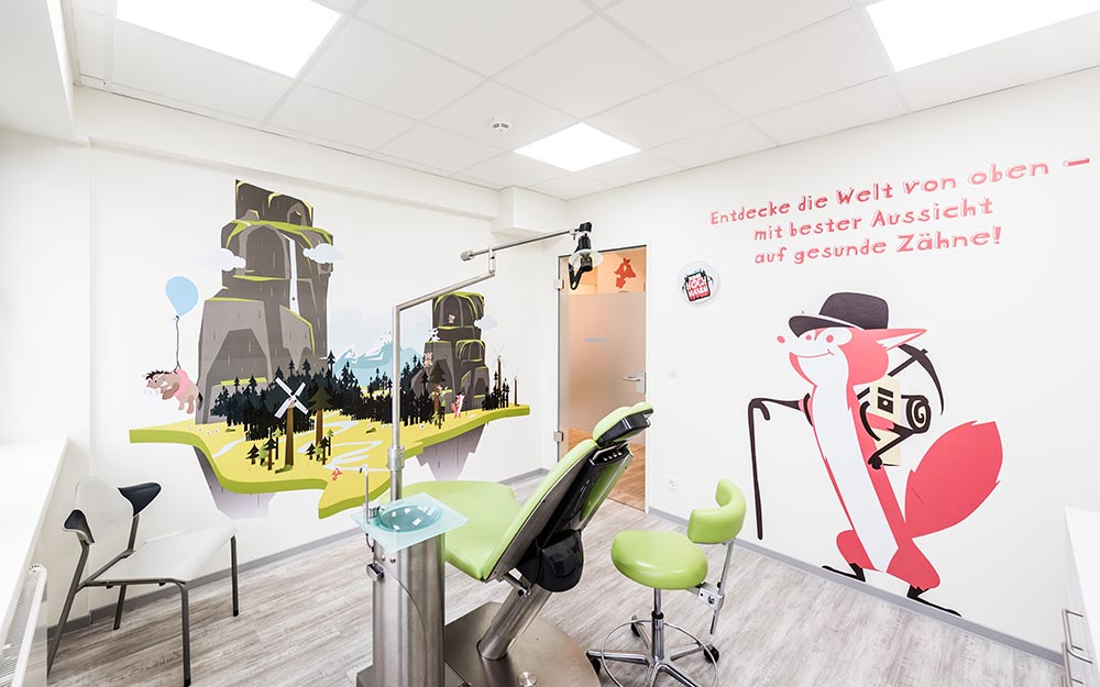 Selbst hochfunktionale Praxisräume sind kindgerecht gestaltet, fröhliche, illustrative Charaktere vermitteln alles Wissenswerte zur Zahnheilkunde. Über die Praxisräume hinaus wird auch die Praxis-Kommunikation von Perfect Day entwickelt.