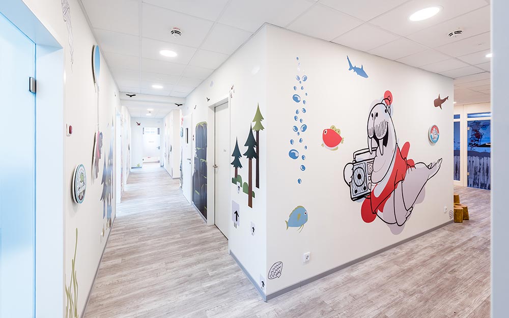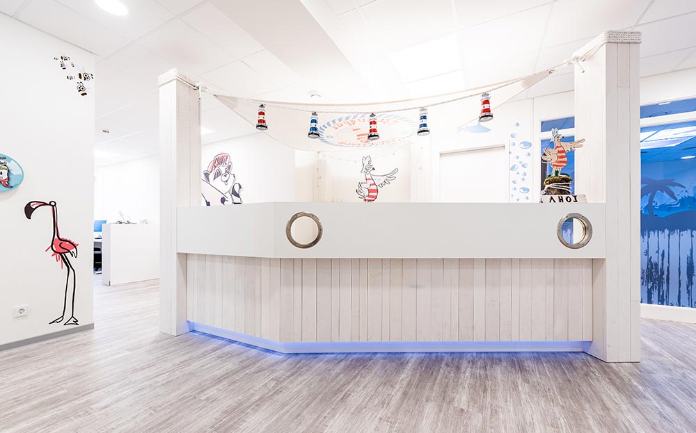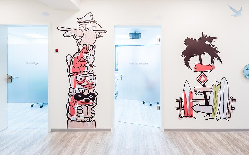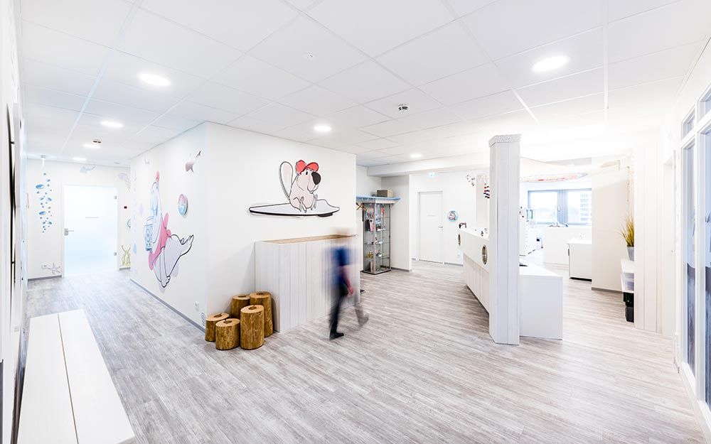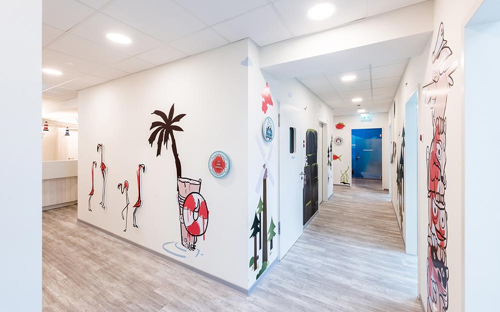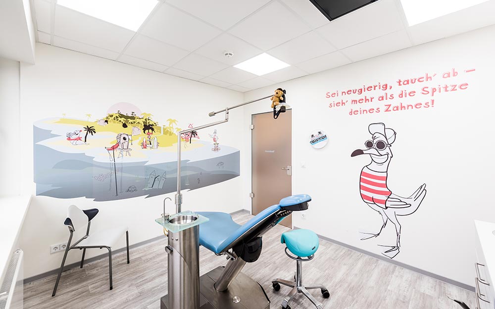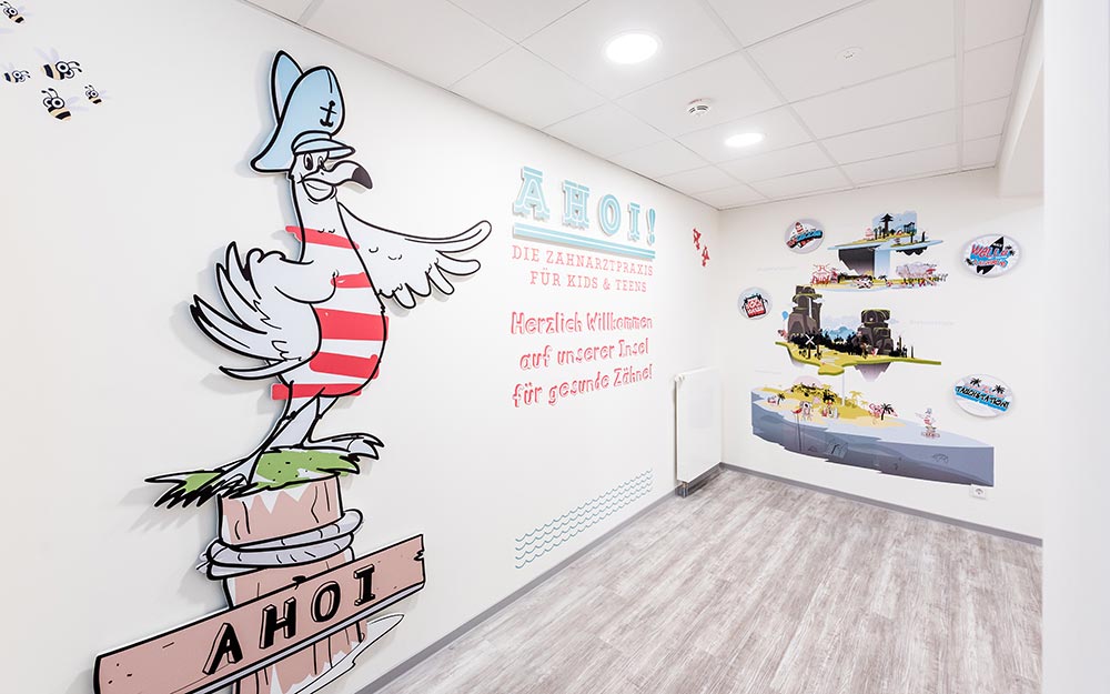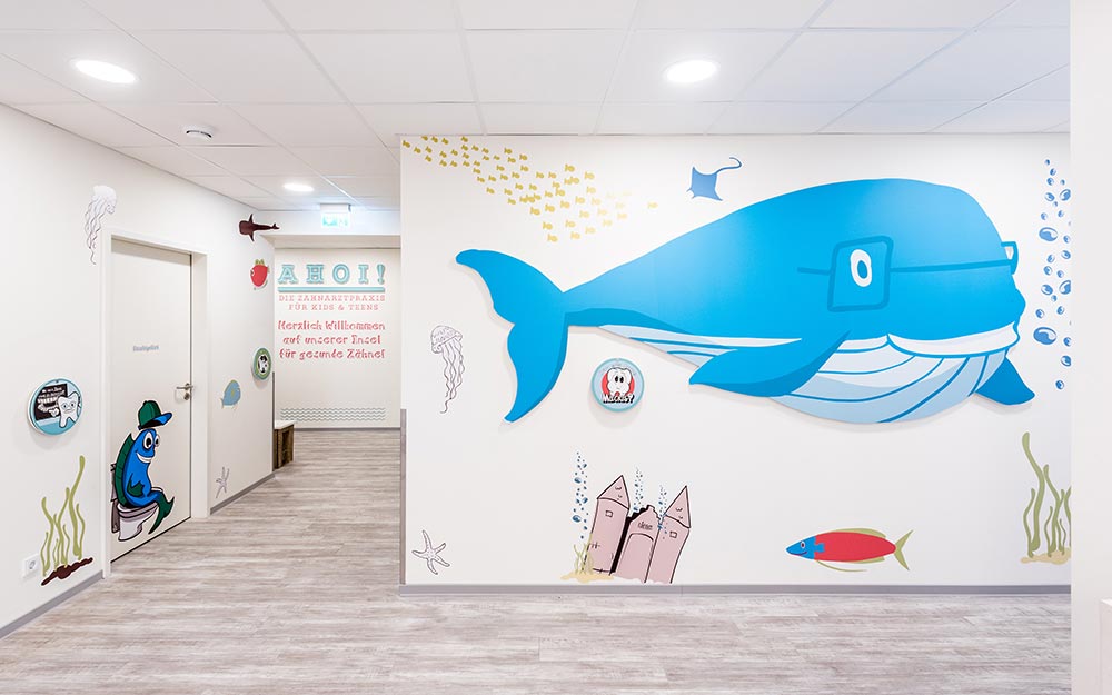 In den Räumlichkeiten der Lübecker Zahnarztpraxis für Kids und Teens ist eine spaßige, nahbare Welt entstanden, die bereits beim Betreten Ängste nimmt und Lust aufs Entdecken macht.