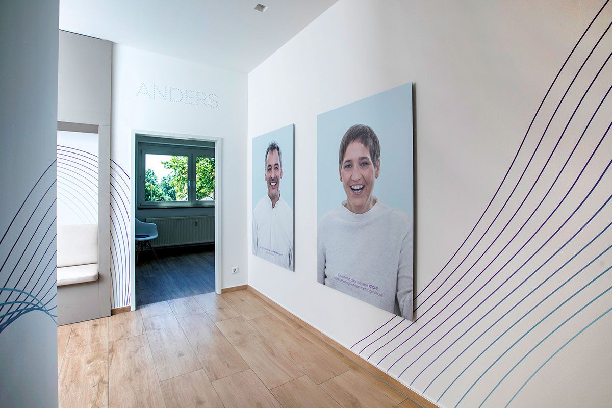 In den Praxisräumen von Dr. Deines begrüßt dieses Lächeln alle Gäste auf ganz vielfältige Art und Weise. Denn im Rahmen der Neupositionierung und einer damit verbundenen Kampagne wurden lächelnde und lachende Patienten – und das damit zum Ausdruck gebrachte Patienten-Vertrauen – in den Fokus gesetzt.