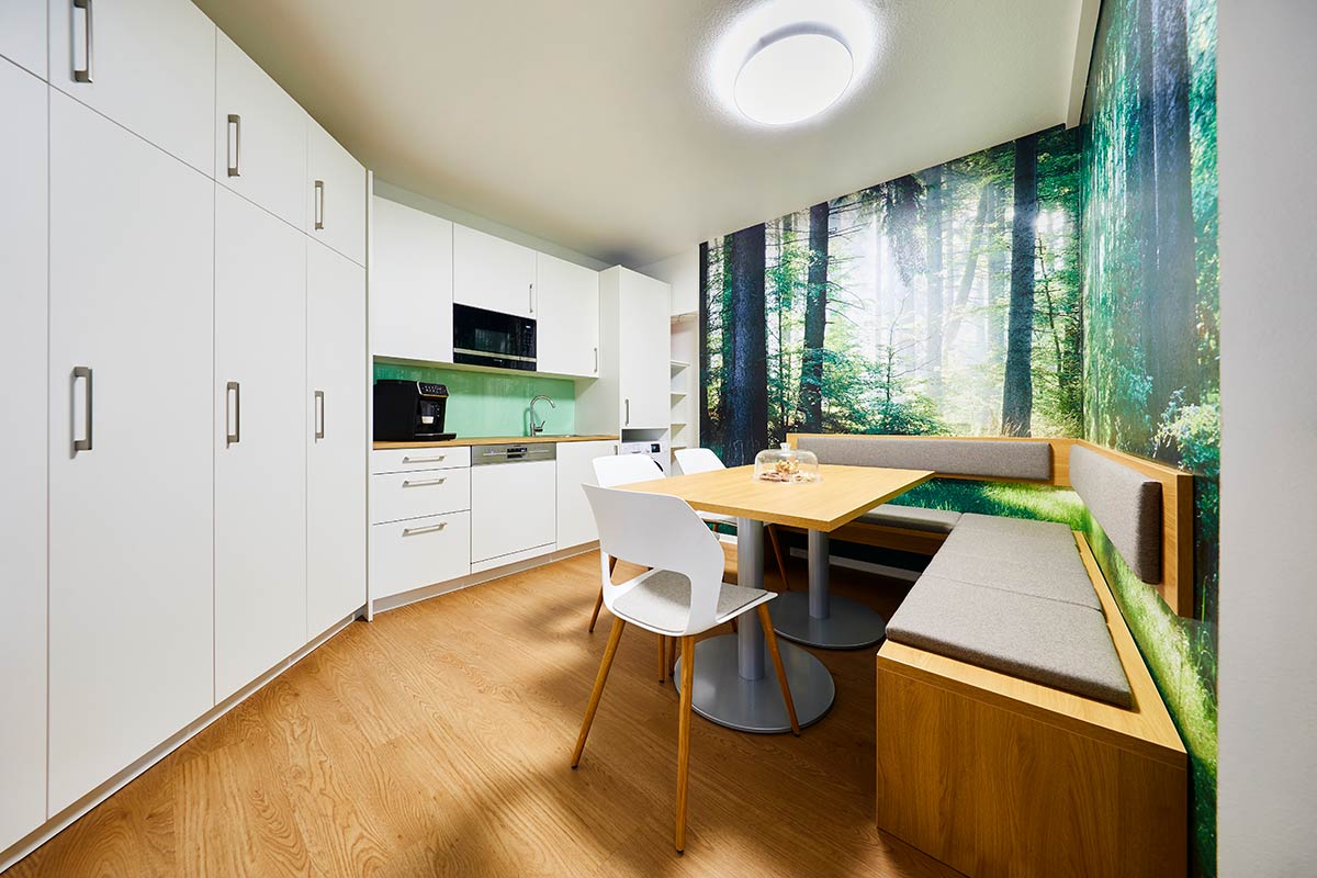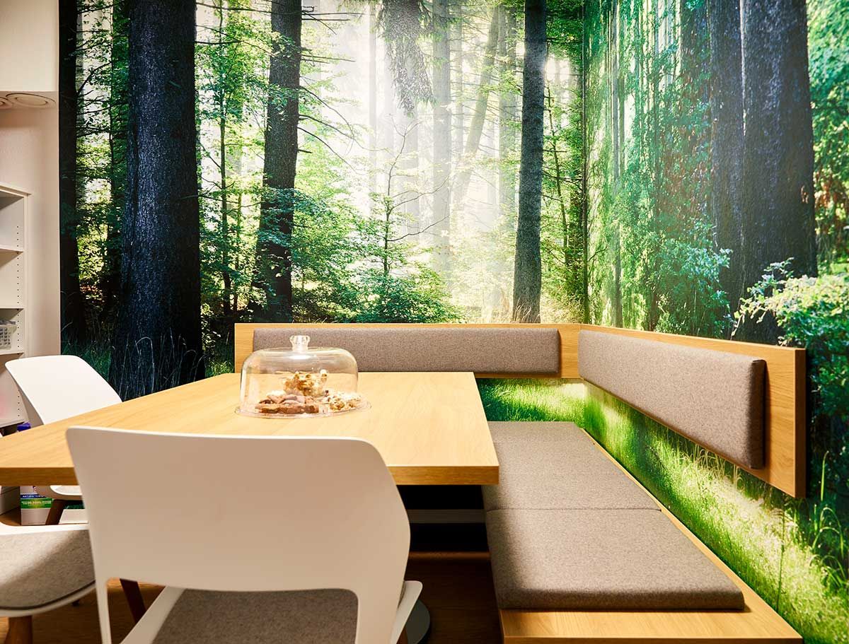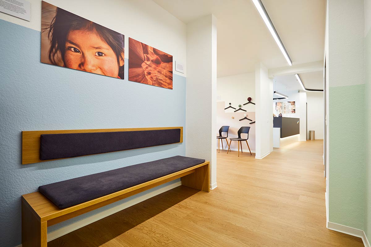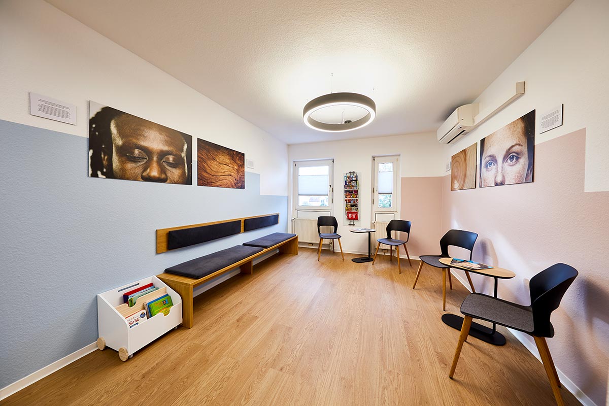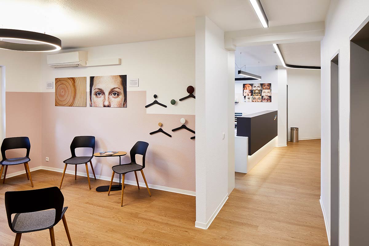 Der zentrale Brückenschlag bestand bei der Gestaltung in der Verbindung zwischen den beiden Elementen Natur und Haut. Das schlug sich zum einen nieder in der Praxisraumgestaltung, die ganz auf naturästhetische Materialien und Farben setzt.